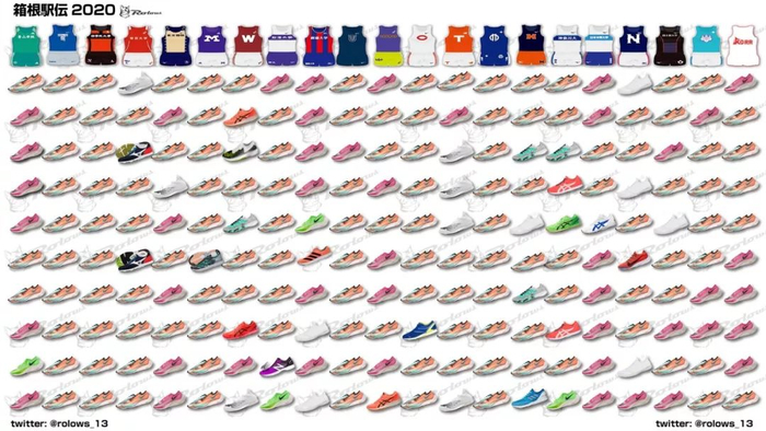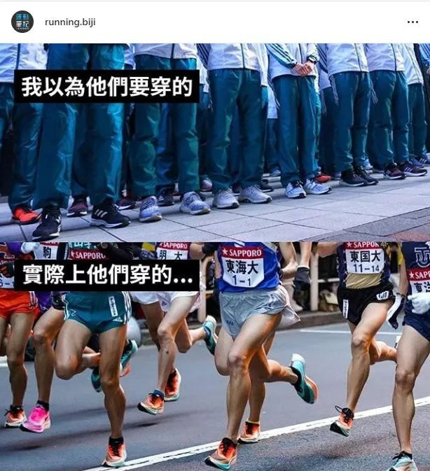 而今年日本第96回箱根驿传,210名学生参赛。赛后选手参赛跑鞋统计图中,几乎被耐克next%跑鞋霸屏,只有三十多名选手穿了其他品牌的跑鞋。夺冠的青山学院大学是阿迪达斯的官方赞助伙伴,但只在领奖时穿了阿迪的跑鞋,比赛的全程都是穿next%跑下来的。
