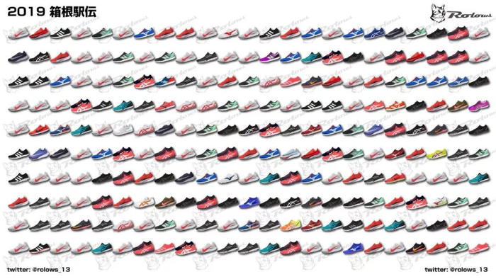 2019年日本第95回箱根驿传,共有230名学生参赛。赛后统计选手比赛时所穿跑鞋,95名选手穿了耐克跑鞋,其中多数为4%。虽然占比已经很大,不过阿迪、亚瑟士、美津浓等品牌“联手”勉强还能与之抗衡。