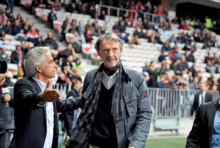 2018年夏天,拉特克利夫用1亿欧元买下了尼斯俱乐部,他的目标是欧冠。图为拉特克利夫与尼斯俱乐部主席让-皮埃尔·里维尔聊天。