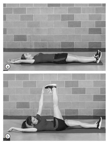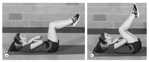 仰卧在地板上,双腿弯曲。双臂交叉放在胸前。上背部稍微离开地面,让目标肌肉保持持续的张力。膝盖抬向胸部,膝盖弯曲90度。收腹,臀部稍微抬高离开地面,并在该过程中抬腿。身体回到起始位置,然后动作重复若干次。