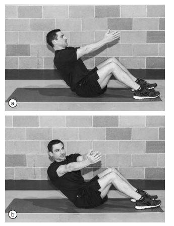 坐在地上,身体与地面夹角呈40度,双膝弯曲。保持手臂在身体前方伸直,手掌相对,核心区平行于地面。保持下半身稳定,肩膀转向一侧,而双脚保持在地板上。转动回到中点,换另一侧重复该动作。两侧交替进行,动作重复若干次。