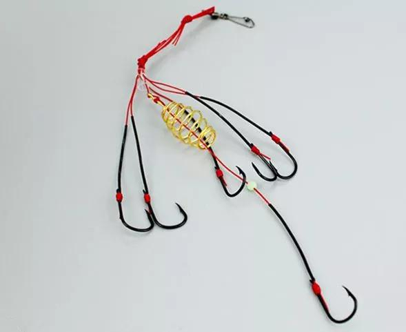 我们在使用爆炸钩时可能大多数都是直接使用从渔具店买来的钓组套装,这样用起来很方便,套装内包含一个大浮漂、一个大眼的通心铅坠、一个装食的食笼和一包大的太空豆,食笼上带有绑好的转环别针,大多为6枚钩子飞在笼子的外面,大概10厘米左右,最下方的钩上的子线略长于其它几个,绑钩的线多为轮胎线或者较粗的尼龙线,使用起来非常结实方便。
