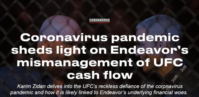 据分析,白大拿之所以暴怒是因为有外媒揭穿了UFC现金流出现问题,所以冒着拳手被感染病毒的危险,继续让比赛照常进行。该外媒写道:“由于UFC母公司Endeavor可能处于困境,因此可以解释UFC继续承办赛事的压力,尽管拳手,员工和公共安全面临不可否认的风险。即使没有现场观众门票收入,UFC仍能在ESPN上播出可观的节目,包括按观看次数付费的节目。”