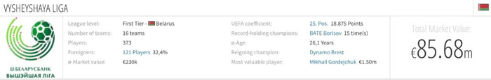 通过德国转会市场官网和维基百科信息,我们大致了解了这个联赛的样貌:白俄罗斯超级联赛又称Vysheyshaya Liga,成立于1992年,采用夏季比赛制度;夺得联赛冠军次数最多的球队正是上面所提到的鲍里索夫,他们曾15次夺魁;2020赛季,联赛拥有16支球队,共计373名球员,联赛的总身价8568万欧元,身价最高的球员是卫冕冠军布列斯特迪纳摩的右边锋Mikhail Gordejchuk,为150万欧元。