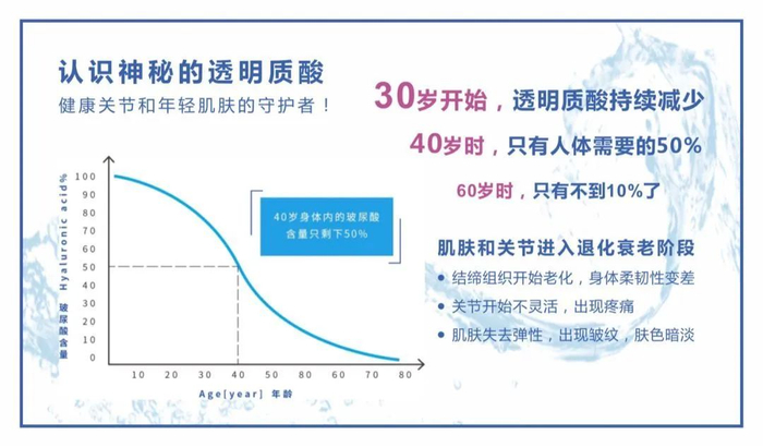 然而,在25岁之后,人体合成透明质酸的能力快速下降,40岁大约还有50%,60岁几乎低于10%。人到中老年,身体已经极其缺乏透明质酸。
