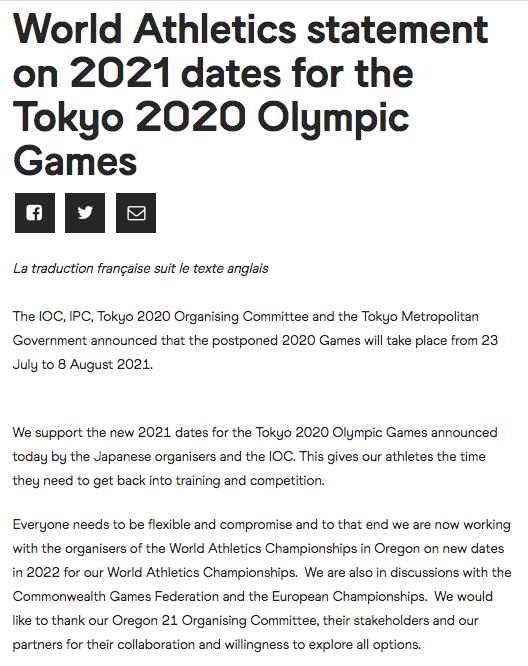 世界田联随后发布通告称,支持东京奥运会的新日期,并表示将2021年世界田径锦标赛推迟到2022年举行。