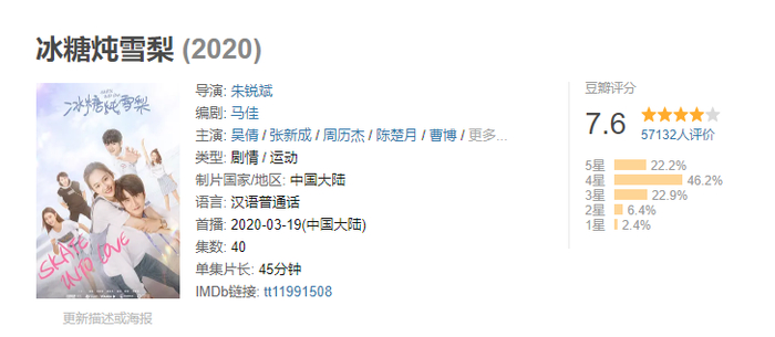 现在《冰糖炖雪梨》剧情过半,豆瓣5万多名用户为其打出7.6分,单从评分来说在国内运动题材相关剧集中是一个不错的分数。不过,大多数好评里可以看出是因为男女主的爱情线或是演员喜爱程度等等,而差评中的大多数是对于剧中竞技元素的吐槽,这也是这部剧缺失的那2.4分关键所在。