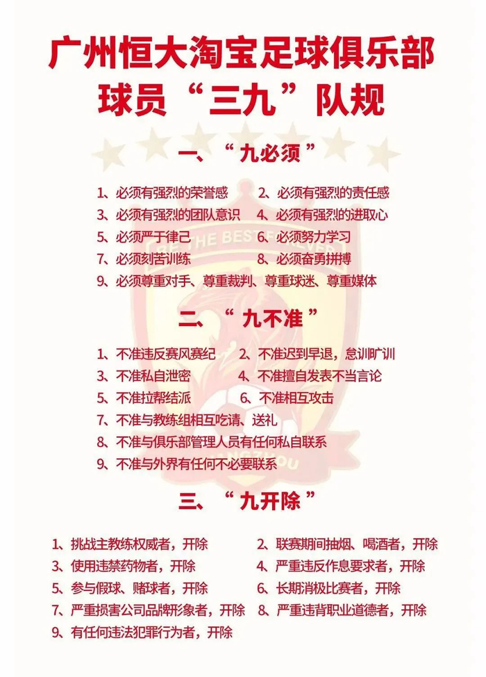 作为恒大援引开除于汉超依据的“三九”队规,有些读者仍一头雾水,不知其具体来历。简言之,2019年2月25日,广州恒大淘宝足球俱乐部正式下发了《广州恒大淘宝足球俱乐部球员“三九”队规》,明确规定球员的 “九必须、九不准、九开除”。
