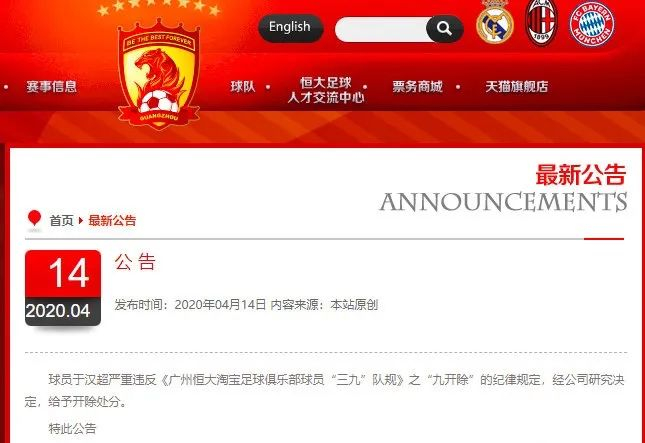恒大官方公告,于汉超违反“三九队规”,给予开除处分