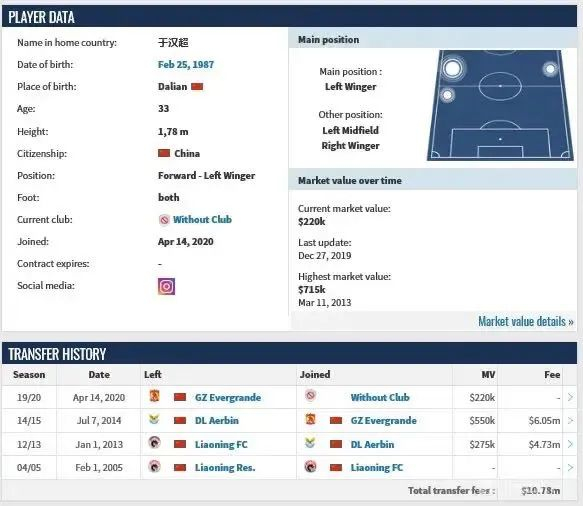 2012年顶着中超“标王”身份,于汉超以4000万元从辽足加盟大连阿尔滨。2014年,于汉超和队友李学鹏打包加盟广州恒大,德转网站标注的于汉超转会费为495万英镑(约合人民币4300万)。受新冠疫情和年龄增加的影响,目前德转对于汉超的身价评估仅为18万英镑(约合人民币160万)。