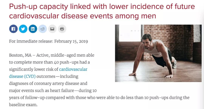 研究结果揭示,在以80个/分钟的频度内、能做40次以上俯卧撑的男性,相比那些只能做10次以下俯卧撑的男性,患心血管疾病的风险降低了96%。