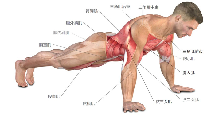 俯卧撑是一项大众化运动,它是一个比较全面的锻炼方式,可以锻炼我们的肱三头肌、腹肌、胸大肌、背肌等等。