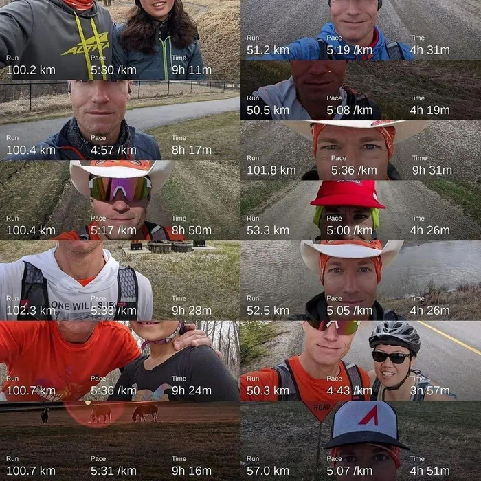 这半个月的时间里,他用7个百公里,6个50公里就完成了挑战,平均配速在5分在5分36秒之间,也是厉害了。