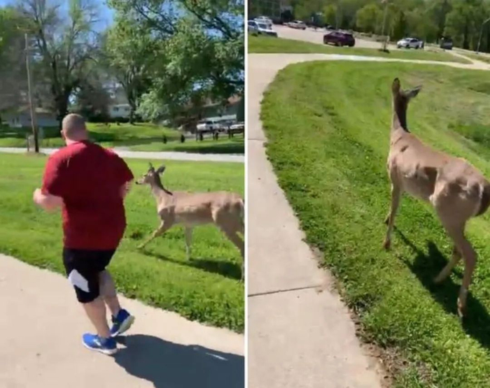 据环球网报道,美国密苏里州的布兰登·利特尔和朋友乍得在慢跑锻炼时,就遇到了一只小鹿同行,此前从未遇见过鹿,让他们十分意外。