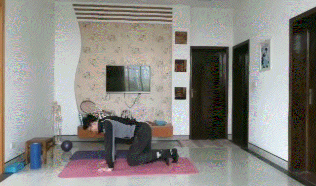 1、身体呈四足爬行姿势下,保持核心稳定的同时,一只腿向后上方伸展,上快下慢。