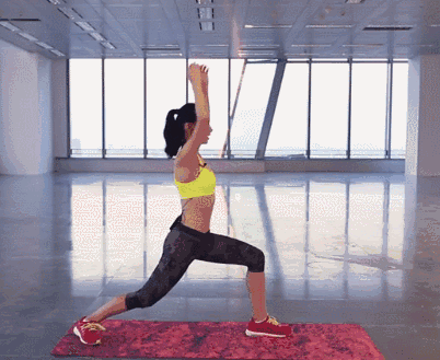 大腿前侧拉伸:迈开弓步后抬起双手,上身微微后仰。保持骨盆向前方,感受位于后大腿前侧的肌肉拉伸。