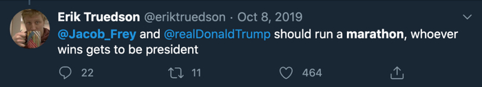 去年10月在川普和弗雷的口水战中,还有网友开玩笑说:弗雷和川普应该跑一场马拉松,谁赢谁就当总统。