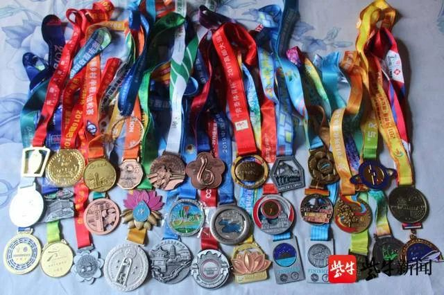 “这是我2014年第一次参加高邮大运河半程马拉松的奖牌,这是我2015年参加扬州鉴真国际马拉松的奖牌,这是我2017年参加江苏省首家乡镇马拉松的奖牌……”