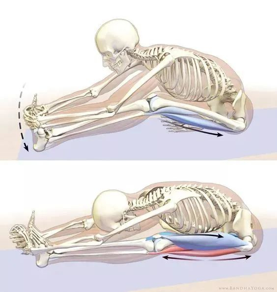 b.大腿后群肌肉牵拉:坐位,躯干向前靠近下肢,保持膝关节伸直,双手尽力去靠近足部,保持30秒,然后换另一侧,共3组;
