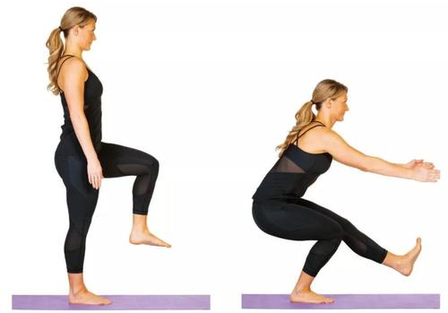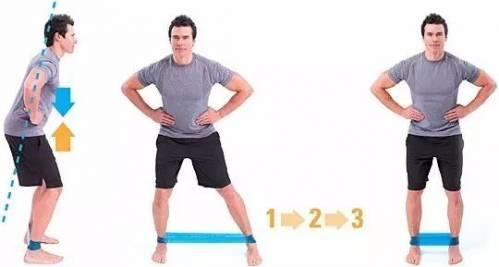 · 单腿下蹲:单腿站立,双手和躯干向前进行屈膝下蹲15次;然后换另一侧,屈膝角度以自身能完成的范围为宜;左右各3组。