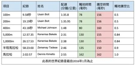 来看上面这张表,各项距离的顶尖高手的一些数据分析。可以明显看到,100米、200米这些短距离,和10000米甚至马拉松等这种长距离相比,他们的腾空时间基本一致。也就是说,像博尔特他们并没有通过蹬地来增加自己的腾空时间。