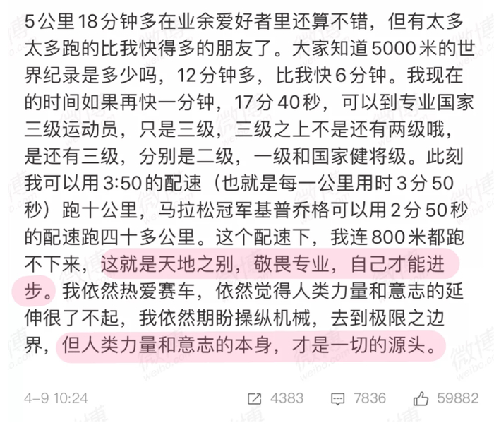 不得不感叹,从30分钟到17分半,韩寒这跑步的潜力,果然如同他曾说的:如果我当年真的好好练的话,我的长跑应该可以到进国家队的水平的。