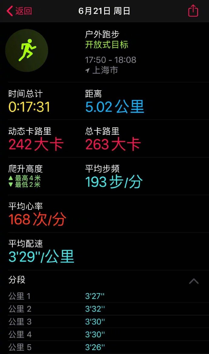 仔细打开照片一看,5.02公里,用时17分31秒,平均配速3分29秒,步频193!这也太豪横了,这何止业余跑者中的大神呀,果然妥妥地达标专业国家三级运动员水平(达标线17分40秒)。