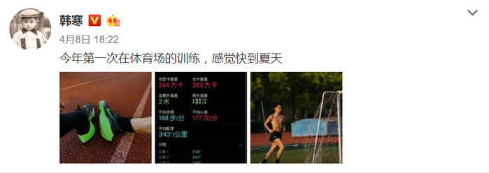昨晚,韩寒更新微博,再次晒出自己5000米的跑步成绩,说:细雨中空旷的体育场,5000米三级运动员达成,终于比20年前的自己更快了。