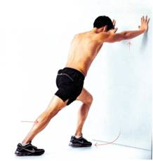 腓肠肌:位于小腿最粗的部位,分布在内外两侧,在脚向后蹬地的过程中起着极其重要的作用。跑步过程中,如果腓肠肌过于紧绷或者跑者用力过猛超出负荷,则会产生痉挛症状。拉伸腓肠肌时,可身体前倾,靠在墙面或是栏杆上;左脚向前弯曲膝盖;右脚伸直向后与身体、头部保持一根直线,脚尖朝前、脚后跟用地固定于地面。动作持续10~15s后两腿交换。
