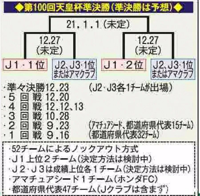 此前日本足协于18日曾召开理事会,决定保留第100届天皇杯并更新赛制。参赛球队数量从往届的88支球队减少至52支,所有比赛从始至终全部采用单场淘汰的方式。J1排名前两名的球队从12月27日的半决赛开始参加,J2和J3的冠军球队,从12月23日的八强赛参加。据悉此次赛制更改主要是为帮助消化掉J联赛的赛程。