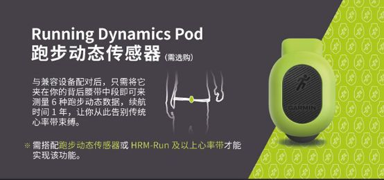 而佳明针对光电式心率表无法测量跑姿的问题,又开发了跑步动态穿戴器(又称为绿豆芽),跑步时将其固定于腰部,就能得到原来心率带才能输出的一些参数。