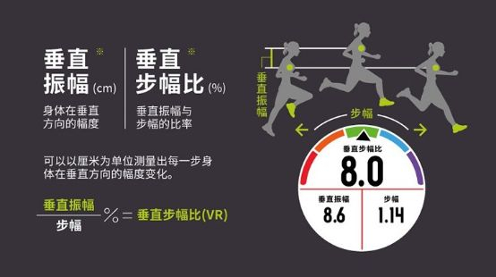 垂直比是用垂直振幅除以步幅,如果身体重心起伏越小,步幅越大,一方面代表你的速度越快,另一方面代表你的跑姿越流畅轻盈。