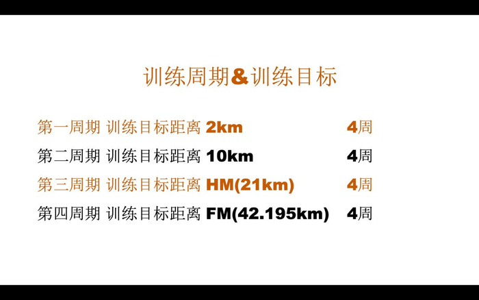 需要特别指出的是,在姿势跑法马拉松训练营中,第4周期的名称虽然为“全马”周期,但是整个训练计划内并没有超过2.5小时的训练。另外,每个阶段还会有相应的技术、肌力、弹力的训练。