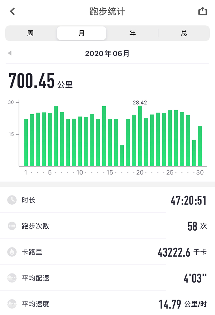昨天我们发的一篇6月份跑量互动中,达子6月跑了700.45公里,跑步次数58次,跑步天数30天,一天没休。