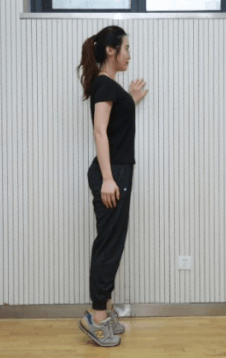 训练要点:站立于带有靠背的椅子后面或墙边,双脚与肩同宽,做踮脚动作,最高点保持10秒后缓慢下落。