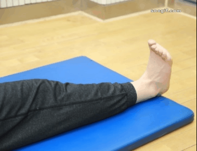 训练要点:平躺在瑜伽垫上,双手放在身体两侧,膝关节伸直,双脚用力向上勾脚,保持5秒,然后用力向下绷脚,保持5秒,训练时注意节律适中,不宜过快。