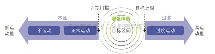 运动量的正确范围称为健身目标区间,通常简称为“目标区间”。它始于训练门槛(身体健康所需的最小超负荷,称为“训练门槛”。运动超过门槛水平时,你可以增进你的健康和体能),其上限称为目标上限。门槛以下的运动不会带来益处。目标上限以上的运动(过度运动)会增加受伤和疼痛的风险,所带来的益处也不是最佳的。