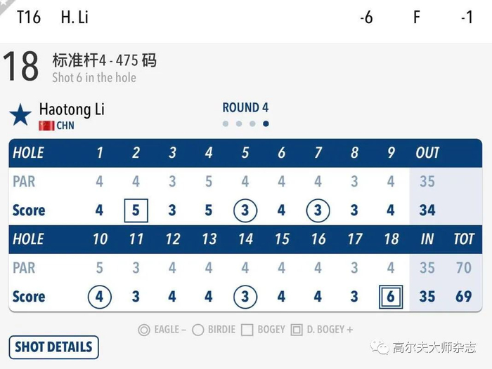 李昊桐在出门的第2洞吞下破击,不过很快在第5洞和第7洞有两只小鸟入账。交出34杆转场后,又抓到两只小鸟。可惜在标准杆4杆的第18洞,李昊桐开球失误,接受一杆罚杆后重新开球,最终以双破击收官。决赛轮交出69杆(-1),总成绩-6最终排在并列第17位。这同时是李昊桐个人在PGA锦标赛上的最佳战绩。