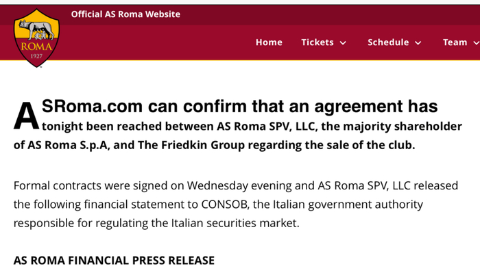 罗马俱乐部在其官网发布易主声明