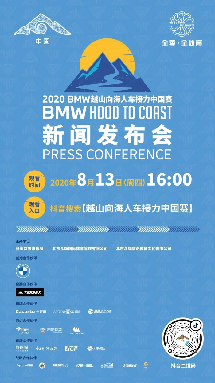 据组委会消息,8月13日(本周四)下午16:00,2020 BMW越山向海人车接力中国赛新闻发布会将在北京召开。