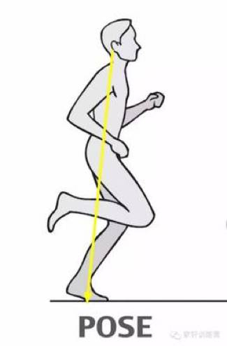 跑步过程中出现的(瞬间)动态平衡状态,就是姿势跑法的核心:关键跑姿。理想的关键跑姿是长这样的(看下图中间那个人姿势):