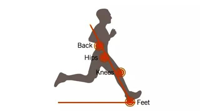 理想状态下,每次着地瞬间身体都应该是关键跑姿,这时头、肩、臀、跖球部都处在一条直线上,这种姿势是个最有效率最省力的姿态。