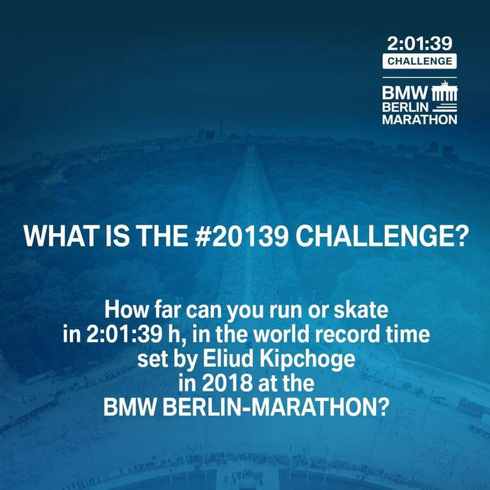 2小时01分39小时你能跑多远?(小编:一个半马)然而这是Eliud Kipchoge在2018年柏林马拉松赛上创造的世界纪录。柏林马拉松组委会希望大家在9月26日-27日,加入一场#2:01:39挑战#,系好你的跑鞋,或者穿上溜冰鞋,骑上你的自行车或轮椅去挑战你的世界纪录!