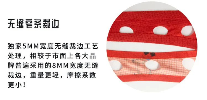 独家5mm宽度无缝裁边工艺处理,相较于市面上各大品牌普遍采用的8mm宽度无缝裁边,重量更轻,摩擦系数更小!