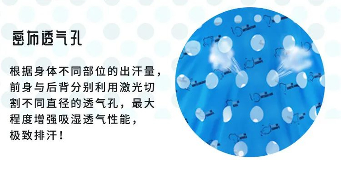 根据身体不同部位的出汗量,前身与后背分别利用激光切割不同直径的透气孔,最大程度增强吸湿透气性能,极致排汗!