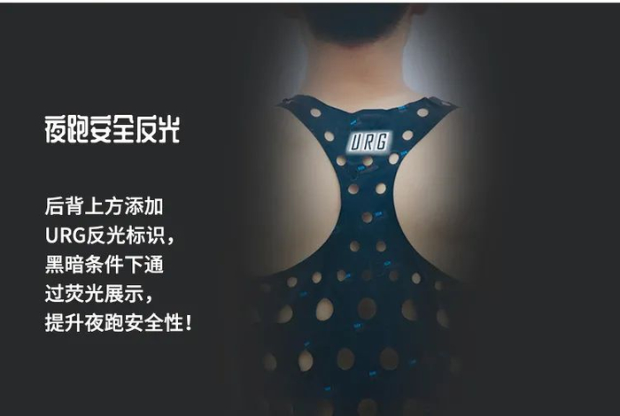 喜欢夜跑的跑友不在少数,因此我们在后背上方添加URG反光标识,黑暗条件下通过荧光展示,提升夜跑安全性!