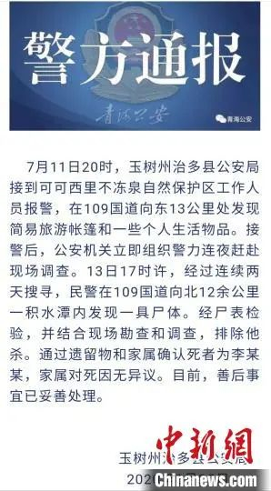 8月25日,青海省玉树州治多县公安局发布警情通报称,民警在可可西里一积水潭内发现一具尸体,排除他杀,通过遗留物和家属确认死者为李某某。