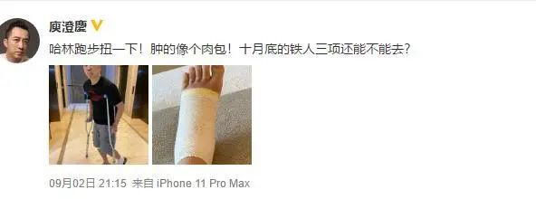 9月2日,歌手庾澄庆发文晒照,透露自己在跑步的时候不小心扭伤了脚,配文称:“肿得像个肉包,十月底的铁人三项还能不能去?”