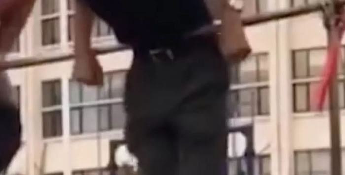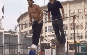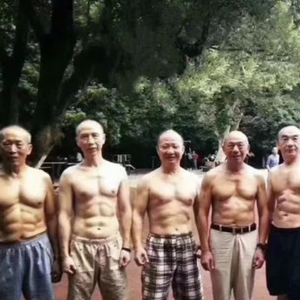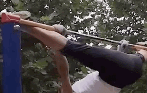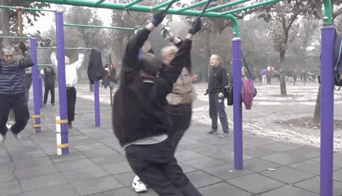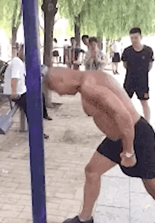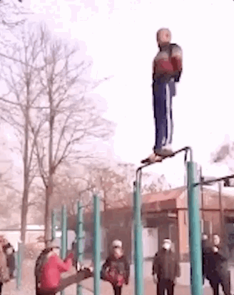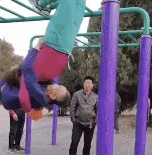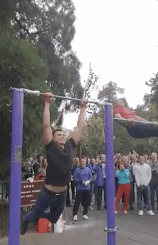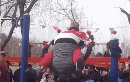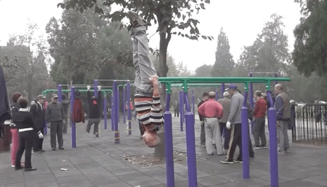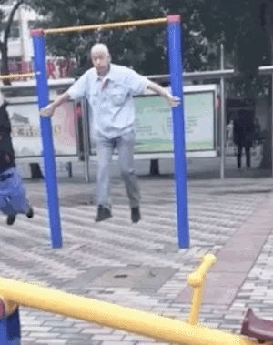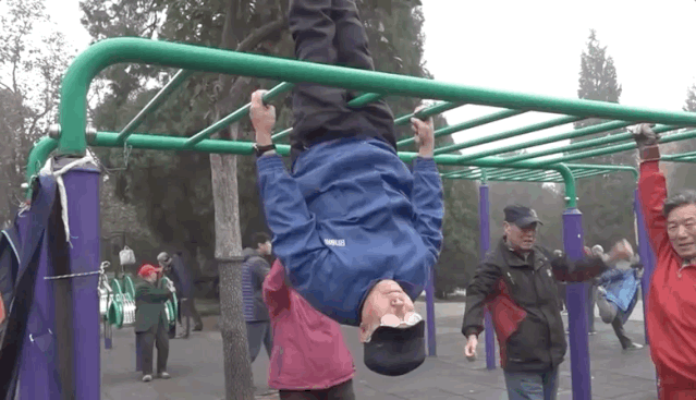 只见大爷轻柔弹跳,双手紧紧抓住单杠上。