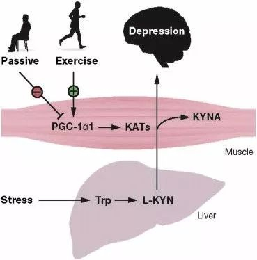 而运动会让肌肉增加一种叫PGC-1alpha1的蛋白质含量,而这种蛋白质可以产生一种酶,让犬尿氨酸转化成犬尿喹啉酸(kynurenic acid)。